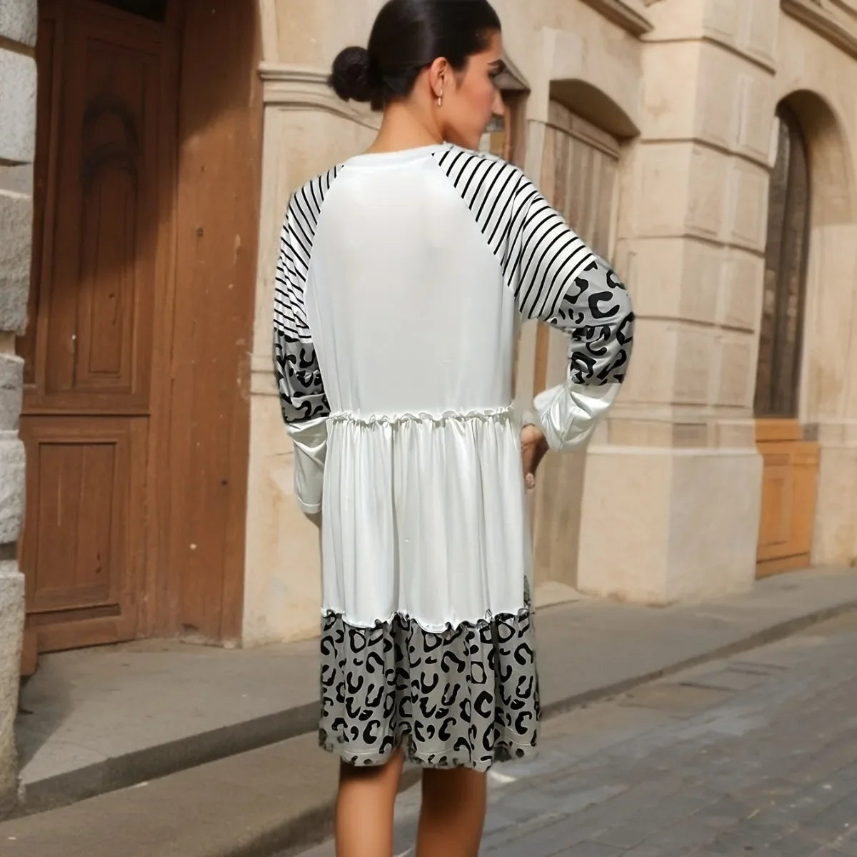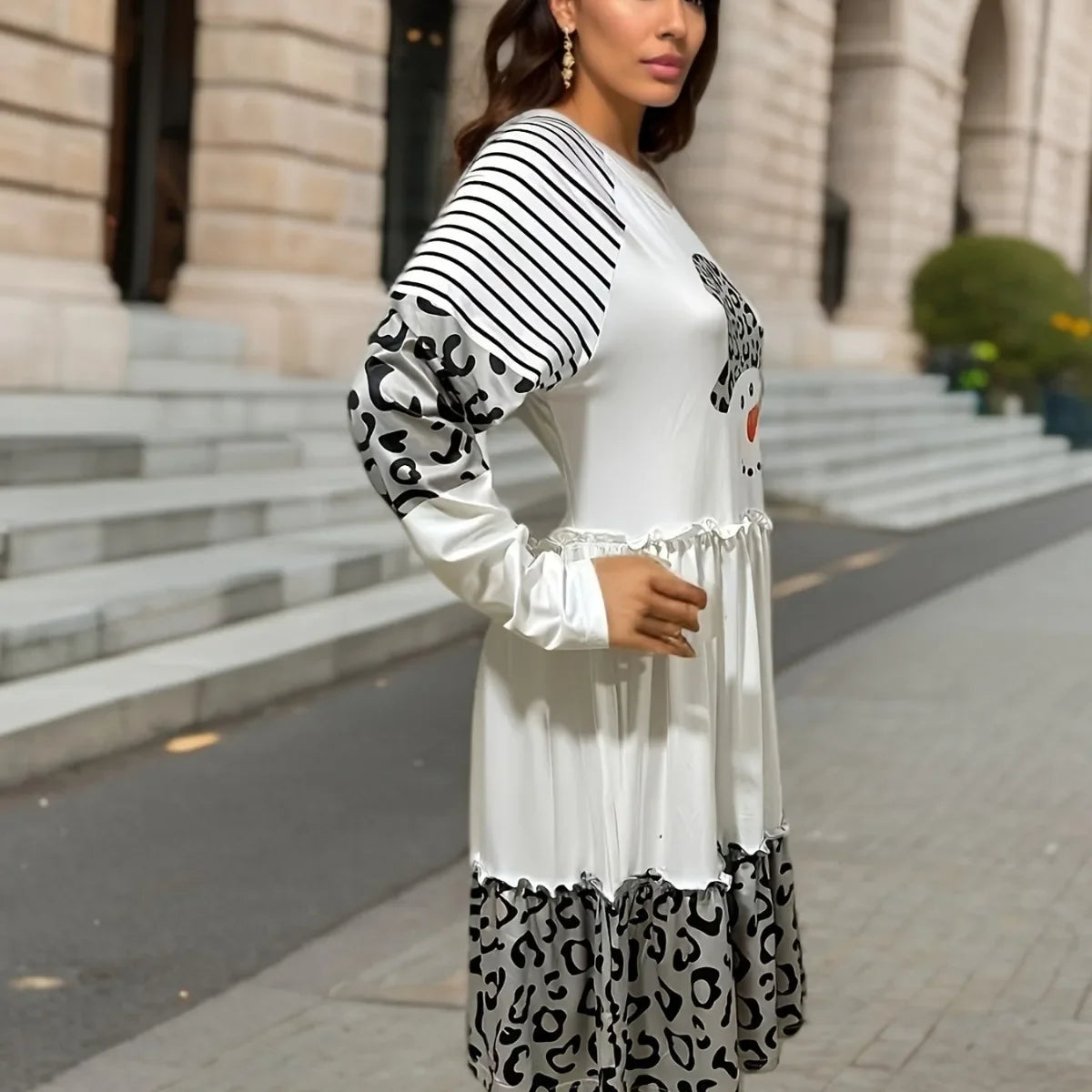 Langarm-Urlaubsstreifen Weihnachtskleid damen mit Leopardenmuster | Midi